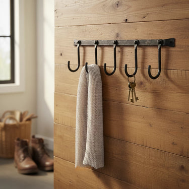 Mit 50 cm Breite bleibt Teun ideal in Linie über einer Bank oder einem Heizkörper. Die metallene Leiste wirkt robust und zeitlos und ist im Handumdrehen montiert – für sofortige Ordnung und einen klaren, industriellen Look.