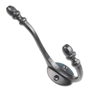 Mit einer Höhe von 133 mm und einer Ausladung von 75 mm bietet der Haken genügend Platz für Jacken, Hüte oder Taschen. Die ovale Wandplatte mit zwei Schraublöchern garantiert eine stabile Befestigung, während das massive Gusseisen für Langlebigkeit und sicheren Halt sorgt.