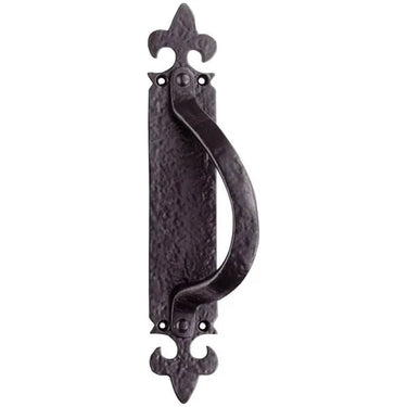 Dieser Fleur-de-Lis Handgriff aus massivem Gusseisen verleiht Türen, Toren und Möbelstücken sofort eine authentische, handwerkliche Ausstrahlung. Das verlängerte Schild mit Lilien-Ornamenten wirkt elegant, während der stabile Griff einen angenehmen Halt bietet.