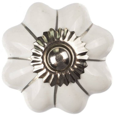 Schrankknopf in Form einer weißen Blume mit silberfarbenen Linien und Beschlägen. Diese Porzellanknöpfe machen in jedem Raum eine gute Figur und verleihen sowohl neuen als auch alten Möbeln einen besonderen Look. Auch im Kinderzimmer sehen diese Knöpfe toll aus.