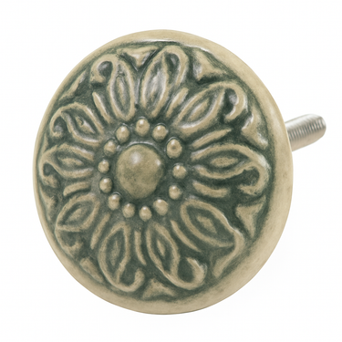 Möbelknopf aus Porzellan mit floralem Relief – Vintage-Weiß/Grün