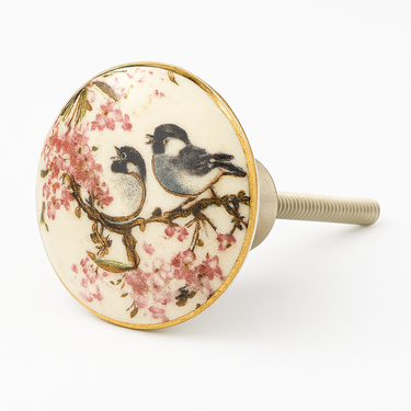 Verleihen Sie Ihrem Interieur mit diesem runden Porzellan-Möbelknopf einen verträumten Landhaus-Look. Das raffinierte Design zeigt zwei Vögel auf einem mit rosa Blüten bedeckten Ast – eine klassische und romantische Szene, die perfekt zu Vintage-, Country- oder Shabby-Chic-Einrichtungen passt. Die sanften Farben und die goldfarbene Einfassung sorgen für ein warmes, elegantes Finish.