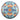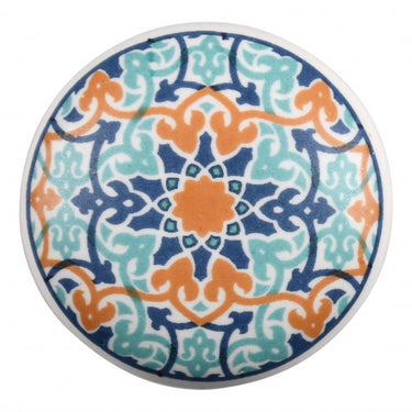 Runder Möbelknauf mit blau-orangefarbenem Muster und Metallrosette