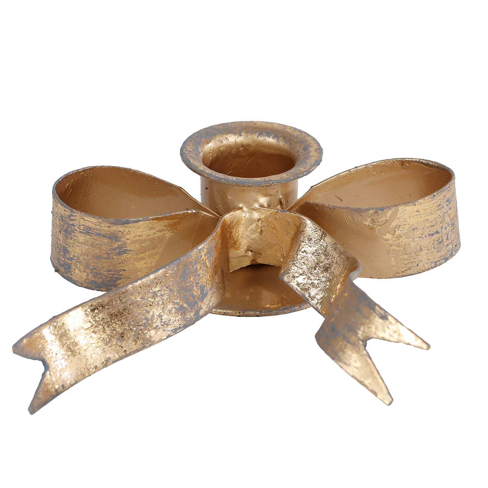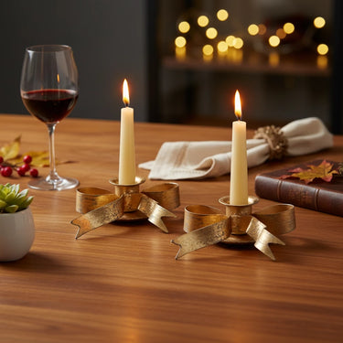 Setzen Sie Tisch oder Sideboard in Szene: Der elegante Kerzenhalter Mae mit dekorativer Schleifenform aus goldfarbenem Metall sorgt für ein festliches Glanzlicht – perfekt für Feiertage, Dinnerpartys oder einen stilvollen Everyday-Look.