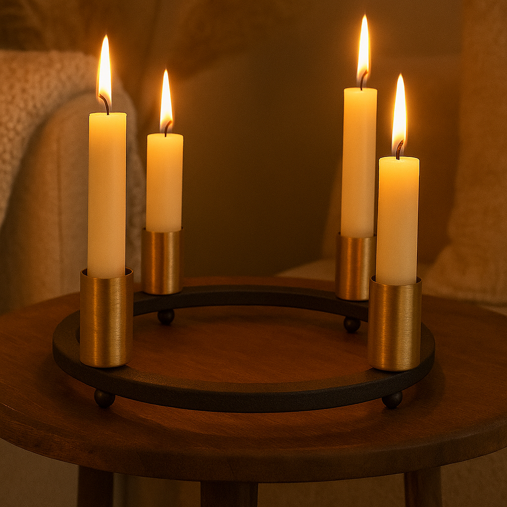 Ein kompakter, runder Kerzenring aus schwarzem Metall mit goldfarbenen Haltern. Wählen Sie die passende Variante: Kandelaber für Stabkerzen oder Teelichthalter – beide modern-rustikal und leicht zu kombinieren.