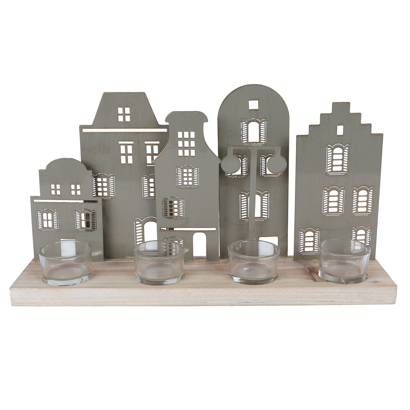 Bringen Sie warm schimmerndes Licht in Ihr Zuhause mit dem Teelichthalter Straat. Die metallenen Häuserfassaden mit ausgestanzten Fenstern lassen das Kerzenlicht verspielt durch die Öffnungen scheinen, während der natürliche Holzsockel für eine ruhige, harmonische Note sorgt.