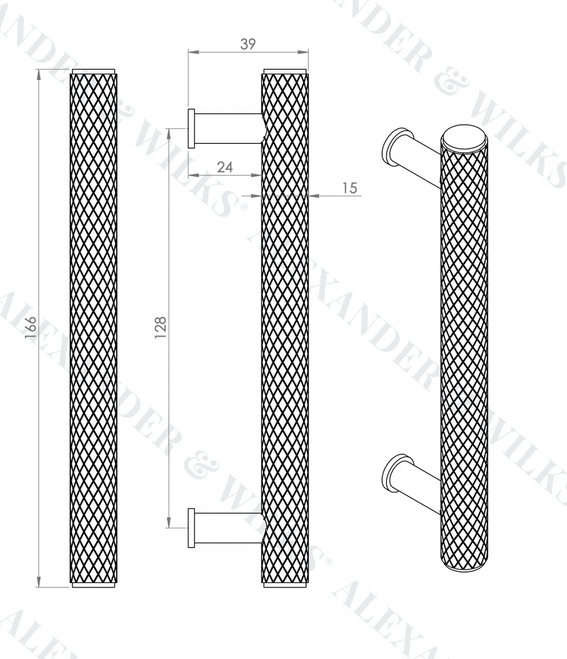 128 mm: Bohrlochabstand 128 mm / Gesamtlänge 166 mm / Höhe 39 mm / Durchmesser 15 mm / Höhe der Füße 24 mm