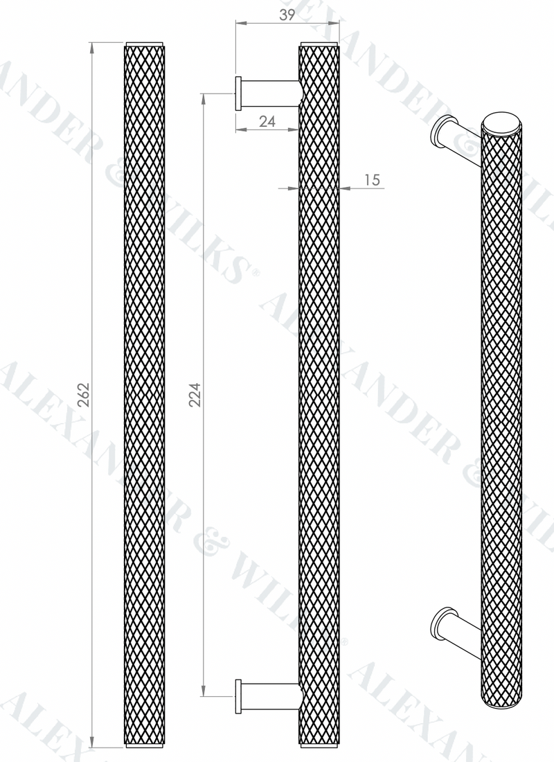 224 mm: Bohrlochabstand 224 mm / Gesamtlänge 262 mm / Höhe 39 mm / Durchmesser 15 mm / Höhe der Füße 24 mm
