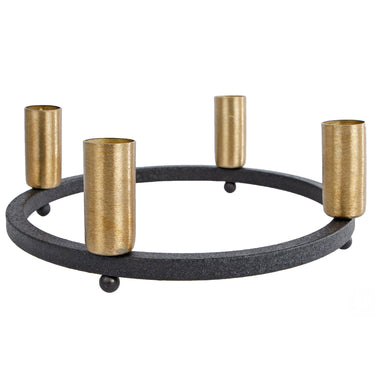 Ein kompakter, runder Kerzenring aus schwarzem Metall mit goldfarbenen Haltern. Wählen Sie die passende Variante: Kandelaber für Stabkerzen oder Teelichthalter – beide modern-rustikal und leicht zu kombinieren.