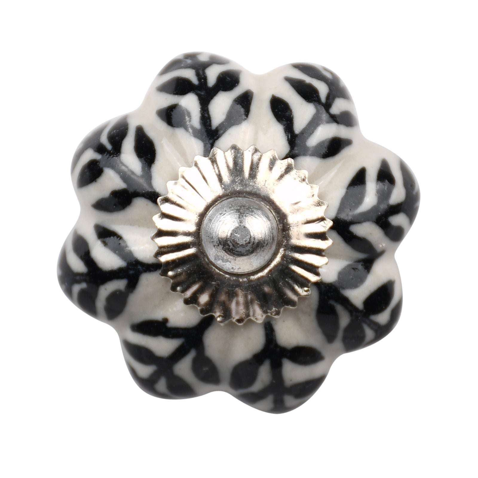 Blumenförmiger Möbelknopf aus Porzellan in Schwarz und Weiß mit silbernen Details