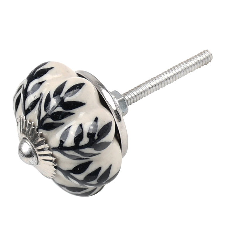 Verleihen Sie Ihrem Interieur mit diesem floralen Porzellanknopf in Schwarz-Weiß mit silbernen Details ein stilvolles Upgrade. Dieser einzigartige Schrankknopf mit schwarzem Blattmotiv kombiniert ein raffiniertes florales Design mit einem weichen, cremeweißen Untergrund und kontrastiert mit eleganten schwarzen Blättern und einem silberfarbenen Metallfinish im Vintage-Stil. Ob Sie Ihre Küchenschubladen, Ihre Kommode oder Ihren Kleiderschrank verschönern möchten, dieser Knopf setzt einen dekorativen Akzent, der nicht unbemerkt bleibt.