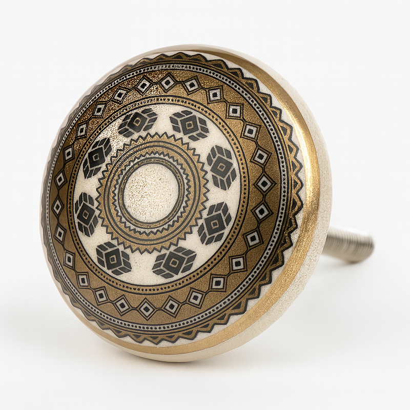 Verleihen Sie Ihrem Interieur mit diesem Porzellan-Möbelknopf mit schwarz-goldenem Muster ein dezent orientalisches Flair. Das feine geometrische Design und die warme Farbkombination auf cremefarbenem Hintergrund sorgen für einen luxuriösen Look. Dieser Porzellan-Schrankknopf eignet sich perfekt für Küchenschränke, Kommoden, Badezimmermöbel oder Nachttische.