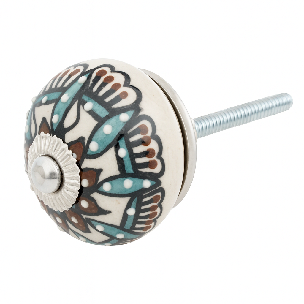 Verleihen Sie Ihren Möbeln mit diesem wunderschönen Keramikknopf mit Blumenmotiv einen einzigartigen Charakter. Das Design „Winterblüte“ ist in warmen Braun- und Grüntönen auf zartem Cremegrund handgemalt. Das zarte Muster erinnert an Blüten oder Blätter in einer Winterlandschaft und verleiht jeder Schublade oder Schranktür eine dezente, dekorative Note.