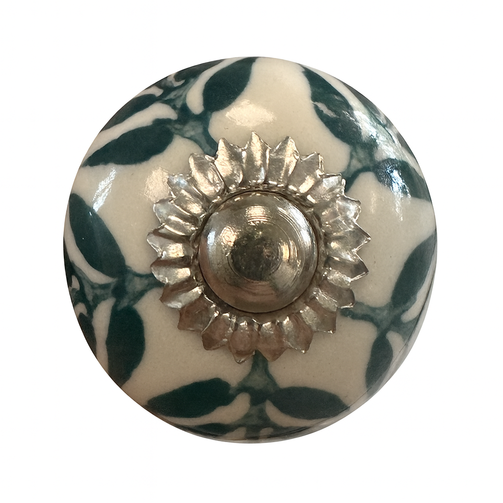 Porzellan Möbelknopf weiß – Petrol Blattmotiv Ø30 mm