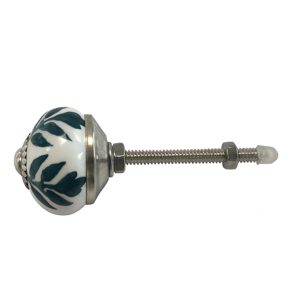 Verleihen Sie Schränken und Schubladen ein frisches Update: Dieser weiße Porzellan-Möbelknopf mit petrolfarbenem Blattmotiv bringt eine natürliche Leichtigkeit in jedes Interieur – ob Landhaus, Boho oder skandinavisch.