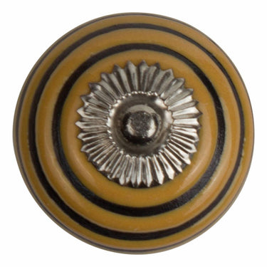 Dieser Porzellanknauf mit schwarzen Streifen auf altgelbem Grund verleiht Schränken und Schubladen sofort ein zeitloses Vintage-Flair. Das glänzende Porzellan kombiniert mit dem silberfarbenen Beschlag passt perfekt zu Landhaus-, Retro- und Boho-Interieurs.